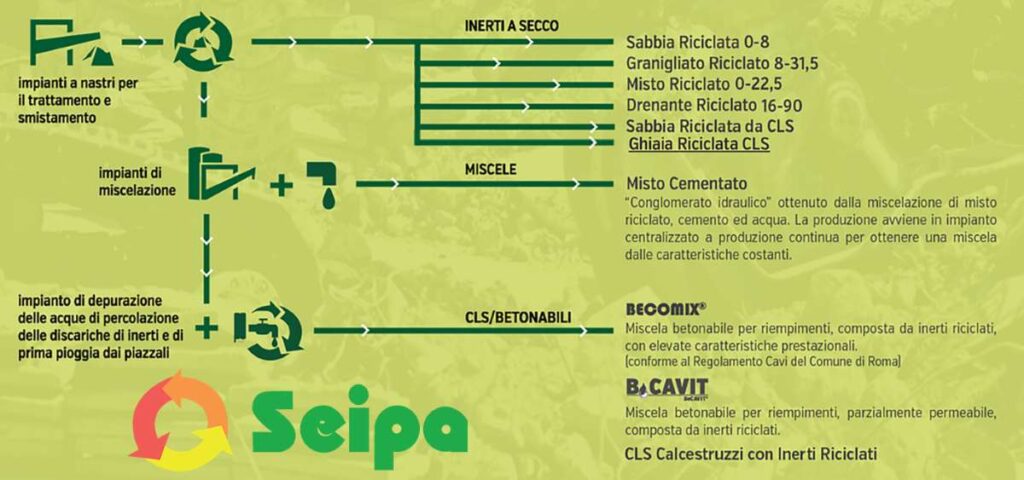 Nel corso degli anni, Seipa ha diversificato la sua attività, includendo la gestione completa del ciclo dei materiali inerti, dalla raccolta al trattamento, fino alla produzione di nuovi materiali edili ecocompatibili ed a base di riciclati. Questa evoluzione ha permesso all’azienda di rispondere in modo efficace alle esigenze di un mercato sempre più orientato alla sostenibilità e al rispetto delle normative ambientali.